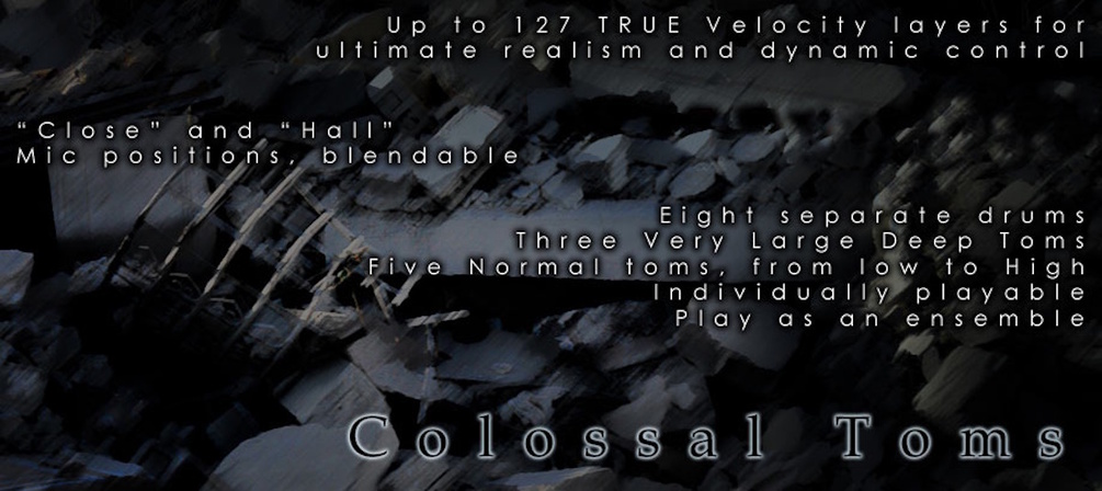 ARIA Sounds are proud to present "Colossal Toms", an ensemble of eight separately playable toms, with tunings from large and deep to high. One of the things that really makes this library stand out, easy to use, and realistic, is that we tried to max out the velocity layers, so each hit has up to 127 different, separately recorded dynamics. This means, on top of the fact that you virtually eliminate the problem of hearing one sample twice too soon, creating an artificial sound, but you can obtain extremely realistic performances.